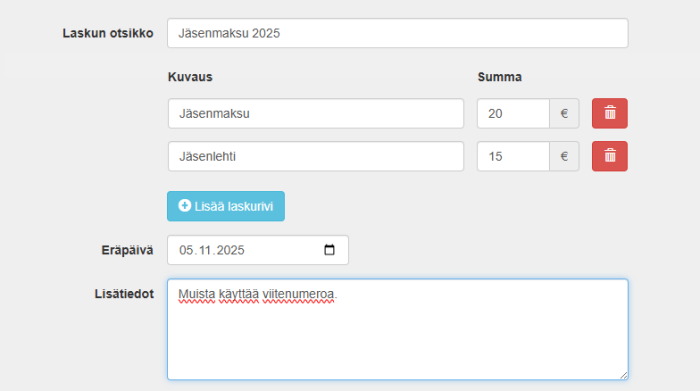 Jäsenmaksulaskut voit lähettää sähköpostilla, kirjeitse tai tulostaa PDF-laskut itse ja toimittaa ne haluamallasi tavalla. Sähköpostilaskun yhteydessä voit lähettää tekstiviesti-ilmoituksen jäsenelle, ja näin varmistaa, ettei lasku huku sähköpostitulvaan. Kirjelaskun yhteyteen voit lisätä myös tiedotteen. Automatisoimalla maksuseurannan säästät rahastonhoitajanne aikaa.